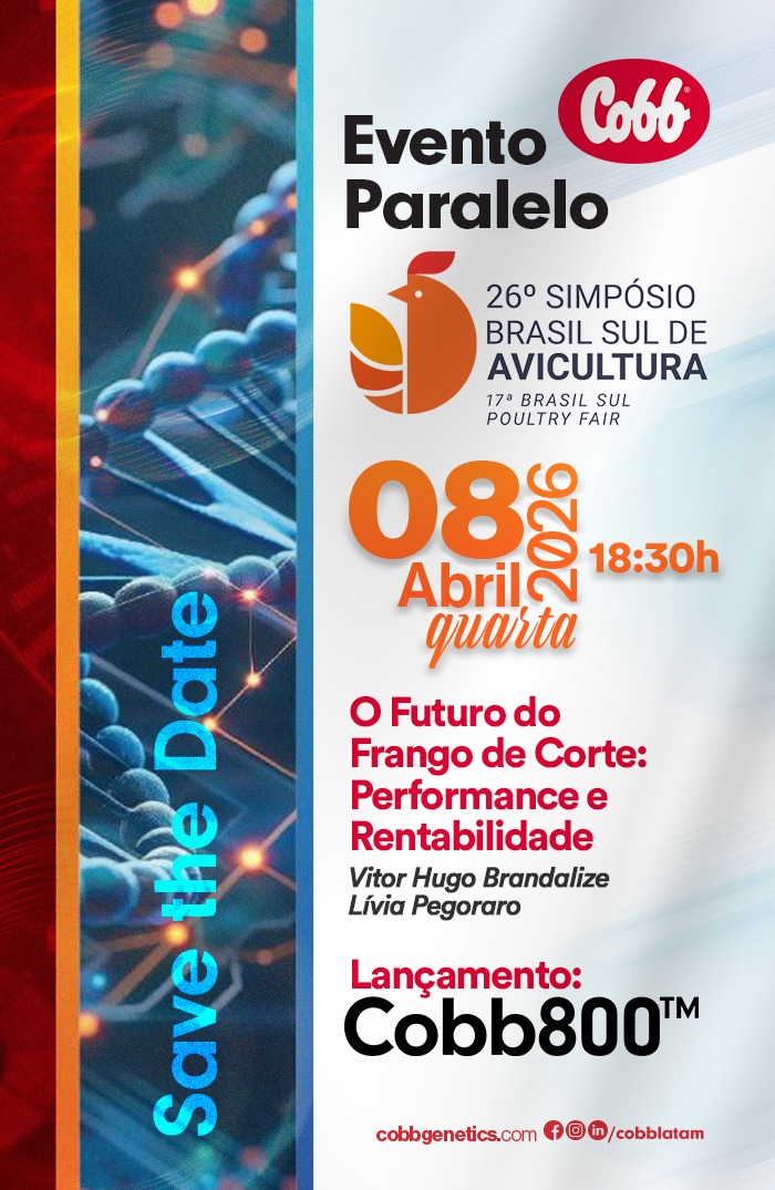 A Cobb-Vantress, empresa de genética avícola mais antiga em operação no mundo, participa da 26ª edição do Simpósio Brasil Sul de Avicultura, em Chapecó (SC), com duas apresentações técnicas voltadas ao aumento da rentabilidade na produção de frango de corte. No dia 8 de abril, especialistas da companhia abordam estratégias de manejo para a ave moderna, com foco em desempenho e rendimento produtivo, além de realizar o lançamento oficial no mercado brasileiro da nova matriz Cobb800.