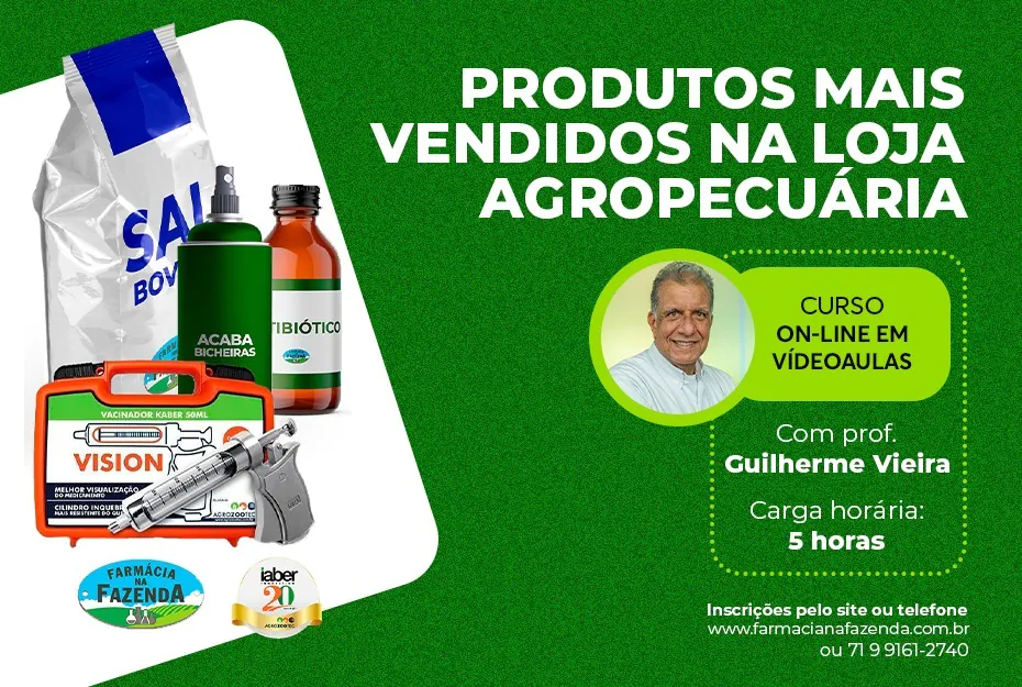 Curso é em videoaulas, composto de 6 (seis) módulos, no qual contém a lista dos produtos mais vendidos em lojas agropecuárias e nos outros módulos tem a descrição de cada produto informando seu princípio ativo.