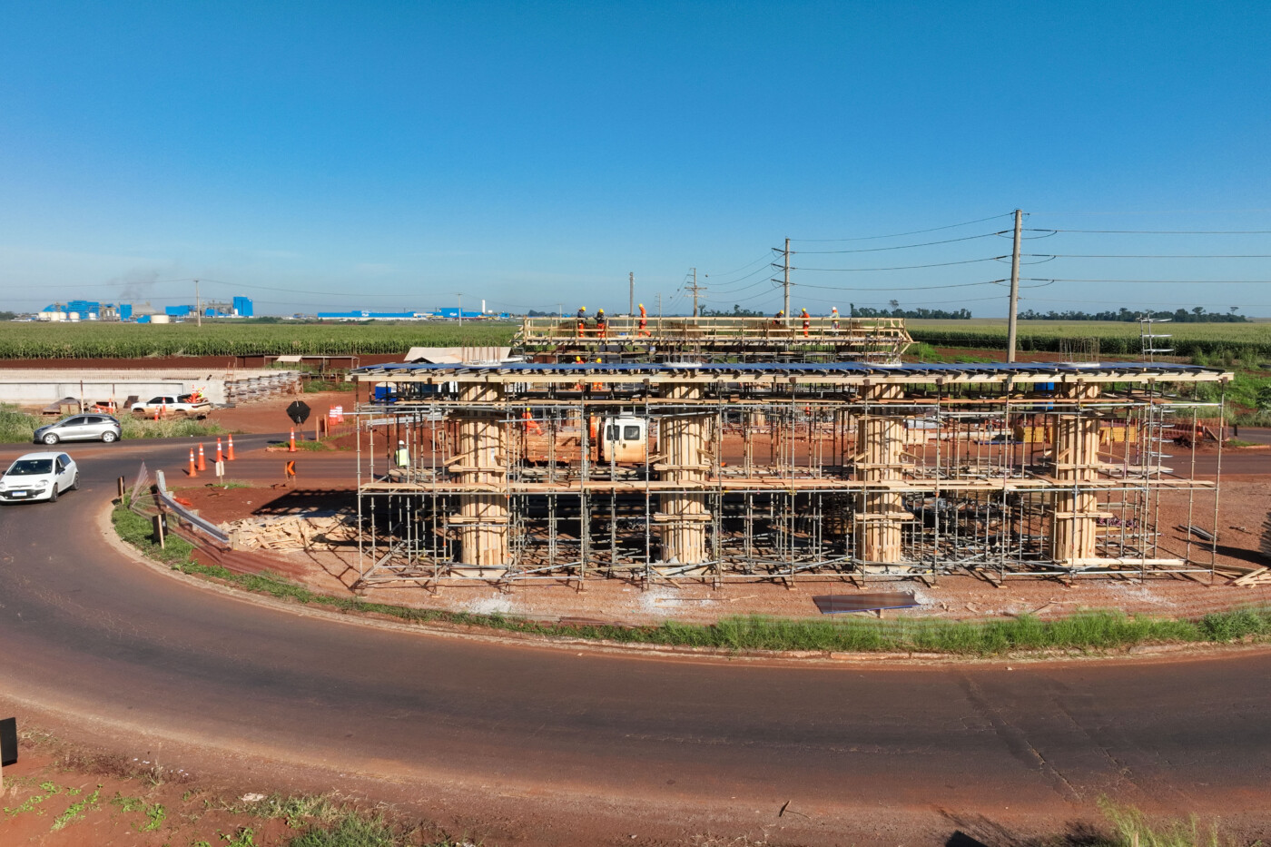 No trevo de acesso às indústrias da cooperativa, a execução dos pilares e vigas de apoio do viaduto alcançou 50% do previsto. Ali, o terreno está sendo preparado para receber as alças de acesso ao viaduto que vão ocupar 5,8 hectares.