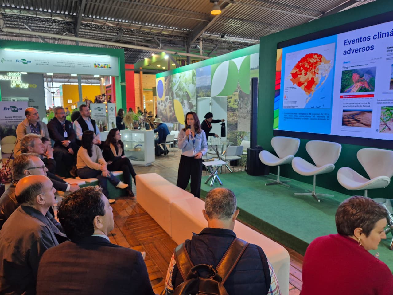 O estande do Ministério da Agricultura e Pecuária (Mapa), no Pavilhão Internacional da Expointer, foi palco para debate sobre as alterações climáticas e a necessidade de uma adequação nos sistemas de produção. Foram três palestras com a apresentação de dados sobre os impactos na infraestrutura rural, na produção agrícola e suas repercussões econômicas. O painel contou com a participação do superintendente do Mapa no Rio Grande do Sul, José Cleber Souza, e do diretor-executivo de Pesquisa e Desenvolvimento da Embrapa, Clenio Pillon.