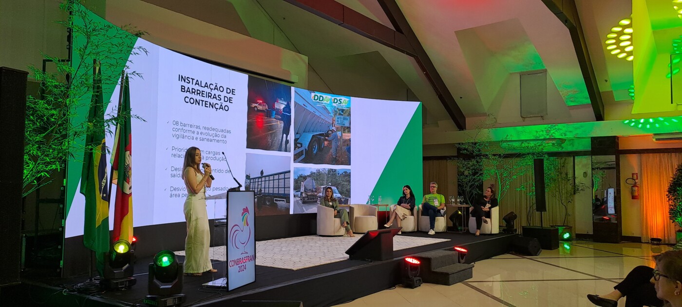 A fiscal estadual agropecuário, médica veterinária e coordenadora do Programa Estadual de Sanidade Avícola da Seapi, Ananda Kowalski, participou do painel “Influenza Aviária e Doença de Newcastle: estratégias e prevenções para mitigar riscos”, mediado pela diretora do Departamento de Vigilância e Defesa Sanitária Animal da Secretaria, Rosane Collares. O painel contou ainda com a presença da auditora fiscal federal agropecuária, responsável e coordenadora institucional do Programa Nacional de Sanidade Avícola do Ministério da Agricultura e Pecuária (Mapa/RS), Taís Oltramari Barnasque.