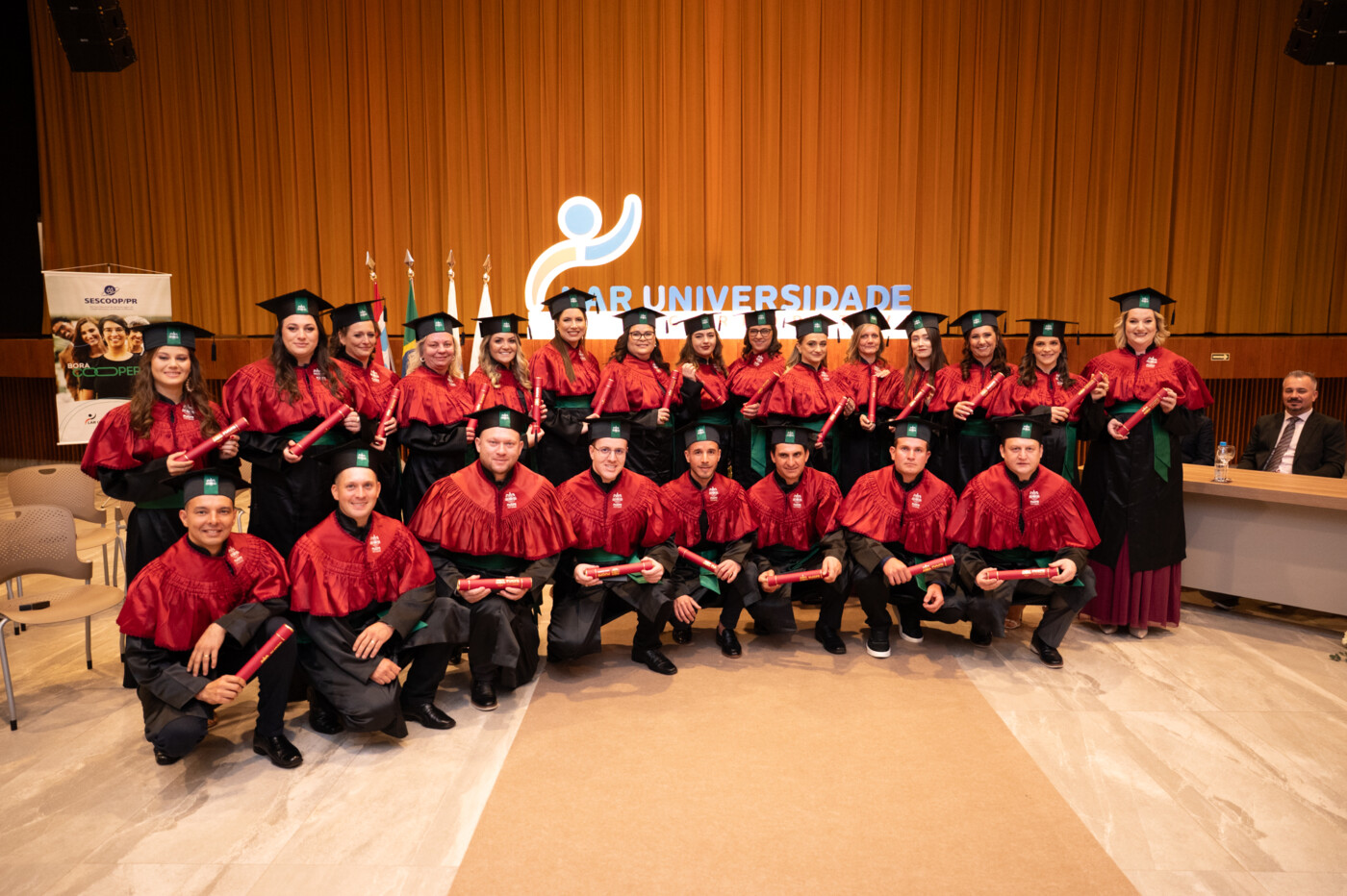 Compuseram a mesa de honra da solenidade o diretor-presidente da Lar, Irineo da Costa Rodrigues, e o diretor do Campus Toledo da PUCPR, Ricardo Lopes, condutores da cerimônia; o 1º vice-presidente da Lar, Diogo Sezar de Matia; o 2º vice-presidente da Lar, Urbano Inácio Frey; o prefeito de Medianeira, Antonio França; o presidente da Câmara de Vereadores, Marcos Berta; o gerente de Desenvolvimento Humano do Sescoop/PR, Leandro Macioski; o superintendente administrativo e financeiro da Lar, Clédio Roberto Marschall, representando as demais superintendências e a Lar Universidade; e o coordenador do curso de GIA da PUCPR, professor Matheus de Lima Goedert.