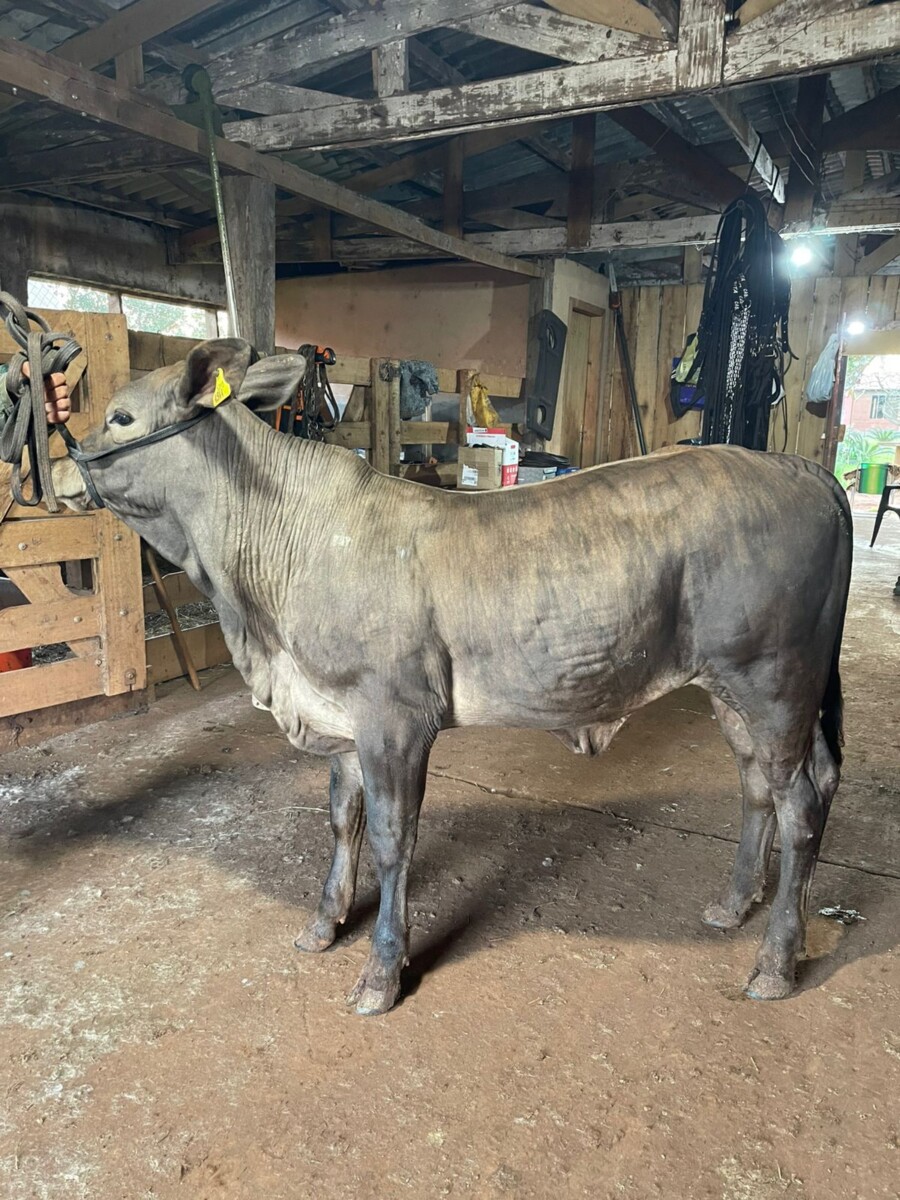 De pelo baio (acinzentado), pesando 198 quilos, nascida em fevereiro deste ano, a terneira Guarita TEG 003 da raça Greyman estará na Expointer 2025, que ocorre de 30 de agosto a 7 de setembro no Parque de Exposições Assis Brasil, em Esteio.