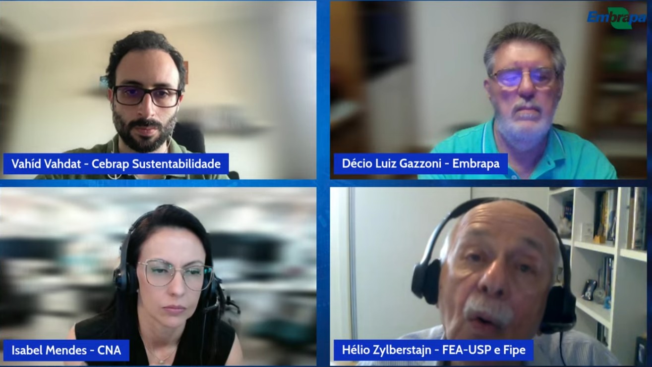 O evento foi coordenado por Job Lúcio Vieira e Pedro Abel, da Assessoria de Estratégia da Embrapa (AEST), e moderado por Décio Gazzoni (Embrapa Soja, Londrina). Participaram do debate Isabel Mendes de Faria (Confederação Nacional da Agricultura, CNA), Hélio Zilberstein (USP) e Vahid Vahdat (Instituto Veredas e UFABC). A transmissão ocorreu pelo YouTube e contou com cerca de cem participantes.