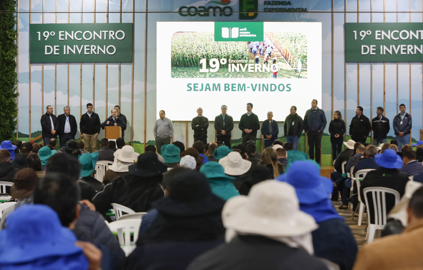 A Coamo realizou, entre os dias 24 e 26 de junho, a 19ª edição do Encontro de Inverno na Fazenda Experimental em Campo Mourão (Centro-Oeste do Paraná). O evento reuniu cooperados do Paraná e de Santa Catarina. Ao longo dos três dias, os participantes percorreram cinco estações temáticas de pesquisa, com foco em culturas de inverno, milho segunda safra, trigo e pecuária. “São assuntos do momento, desafios que estamos enfrentando e que os cooperados podem aplicar imediatamente em suas propriedades”, afirma o diretor de Suprimentos e Assistência Técnica da Coamo, Aquiles de Oliveira Dias.